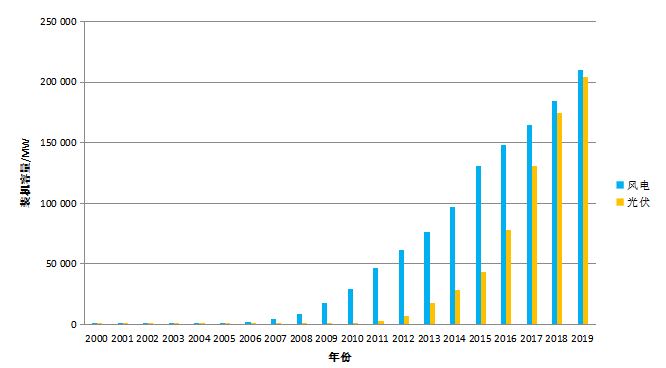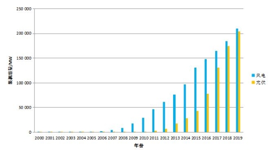 “十三五”時(shí)期,我國(guó)新能源發(fā)展成效顯著,裝機(jī)規(guī)??焖僭鲩L(zhǎng),開(kāi)發(fā)布局不斷優(yōu)化,技術(shù)水平顯著提升,度電成本持續(xù)下降,政策體系逐步完善,新能源已經(jīng)從補(bǔ)充能源進(jìn)入到主力能源的發(fā)展階段。截至2019年末,全國(guó)風(fēng)電累計(jì)裝機(jī)21005萬(wàn)千瓦,其中陸上風(fēng)電累計(jì)裝機(jī)20412萬(wàn)千瓦、海上風(fēng)電累計(jì)裝機(jī)593萬(wàn)千瓦;全國(guó)光伏發(fā)電累計(jì)裝機(jī)達(dá)到20430萬(wàn)千瓦,其中集中式光伏14167萬(wàn)千瓦,分布式光伏6263萬(wàn)千瓦[1][2]。風(fēng)電和光伏發(fā)電裝機(jī)容量均實(shí)現(xiàn)“十三五”規(guī)劃目標(biāo)。