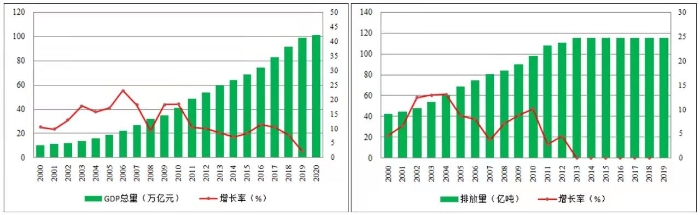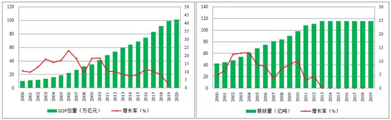 自進(jìn)入21世紀(jì)以來(lái),我國(guó)經(jīng)濟(jì)快速發(fā)展,我國(guó)的碳排放量也在快速攀升。相關(guān)研究數(shù)據(jù)[2]顯示,2019年我國(guó)碳排放量約115億噸,約占全球總排放量的30%,位居全球第一,較2000年我國(guó)碳排放量提高約168%。21世紀(jì)以來(lái)我國(guó)的碳排放量和GDP增長(zhǎng)情況見(jiàn)下圖1。