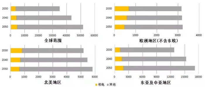 圖6 全球及典型地區(qū)電力供應(yīng)預(yù)測(cè)-核電高低方案平均(單位:TW·h)