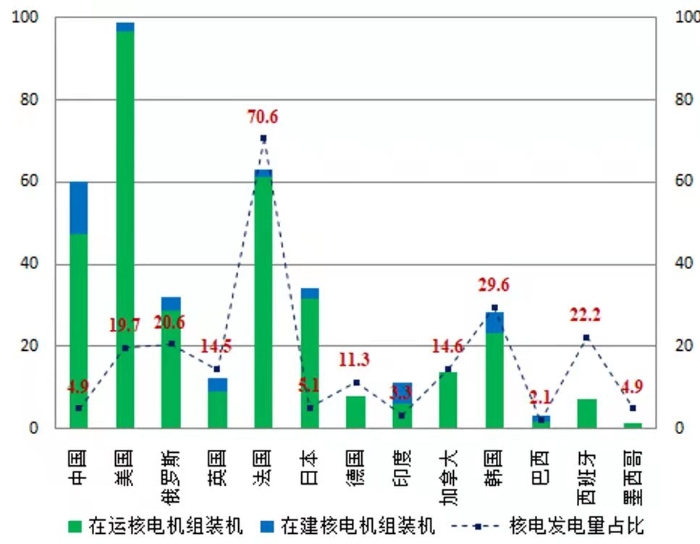 圖7 2020年全球GDP前15強(qiáng)國(guó)家核能發(fā)電情況(單位:GW,%)