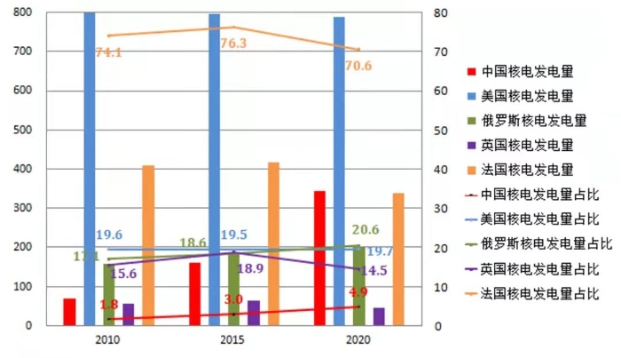 圖8 2010-2020年5大常任理事國(guó)核電發(fā)電量及占比情況(單位:TW·h,%)