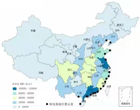 圖9 我國(guó)各省區(qū)市經(jīng)濟(jì)發(fā)展及核電基地位置示意