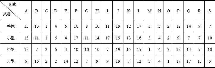 參考國家統(tǒng)計(jì)局公布的《統(tǒng)計(jì)上大中小微型企業(yè)劃分辦法(2017)》,可將本次受訪企業(yè)根據(jù)年主營業(yè)務(wù)收入規(guī)模劃分為大、中、小三個(gè)規(guī)模類型。不同規(guī)模企業(yè)對(duì)項(xiàng)目資本結(jié)構(gòu)影響因素的重視程度的統(tǒng)計(jì)結(jié)果如表7所示。