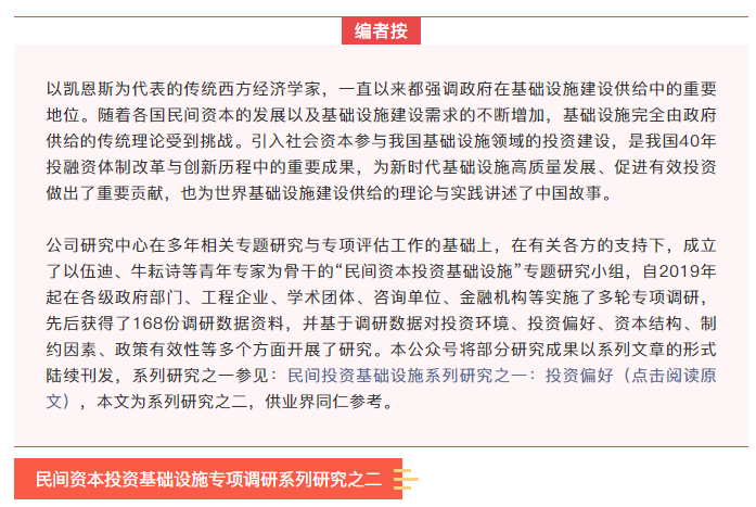 隨著我國城鎮(zhèn)化發(fā)展速度的不斷加快,基礎(chǔ)設(shè)施的投資建設(shè)需求也不斷增加。在目前傳統(tǒng)基建尚需進(jìn)一步完善、新基建發(fā)展利好的背景下,加強(qiáng)基礎(chǔ)設(shè)施建設(shè)不僅具有現(xiàn)實(shí)意義,更有戰(zhàn)略意義。然而,基礎(chǔ)設(shè)施項(xiàng)目往往投資規(guī)模較大,建設(shè)運(yùn)營周期較長,給政府財(cái)政帶來了較大的壓力?;A(chǔ)設(shè)施的發(fā)展需要充分發(fā)揮市場作用,支持多元主體參與投資建設(shè),民間資本在我國基礎(chǔ)設(shè)施建設(shè)進(jìn)程中發(fā)揮了重要作用。