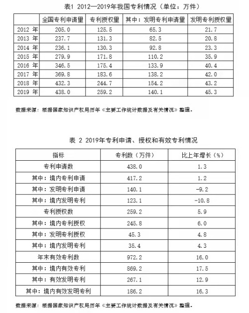 從科研成果看,2012—2019 年,我國專利申請量從 205.1 萬件增加至 438 萬件,專利授權量從 123.5 萬 件 增 加 至 259.2 萬件, 年均增長率分別達到 11.4% 和 10.9%。其中,發(fā)明專利的申請量和授權量年均增長率分別達到11.5% 和11.1%(見表 1)。截至2019 年底,我國共擁有有效專利972.2 萬件,年度環(huán)比增長16%。其中,境內(nèi)有效專利 869.2 萬件,增長17.5% ;境內(nèi)有效發(fā)明專利186.2 萬件,增長16.3%(見表 2)。目前,我國發(fā)明專利申請量和授權量、PCT 國際專利申請量均居世界首位,科技論文和自然科學指數(shù)排名僅次于美國。世界知識產(chǎn)權組織發(fā)布的“全球創(chuàng)新指數(shù)”顯示, 我國創(chuàng)新排名從2015 年的第29位躍居到2020年的第14位。目前,我國科技進步對經(jīng)濟增長的貢獻率已經(jīng)達到60%,科技創(chuàng)新已成為經(jīng)濟發(fā)展的主要推動力。