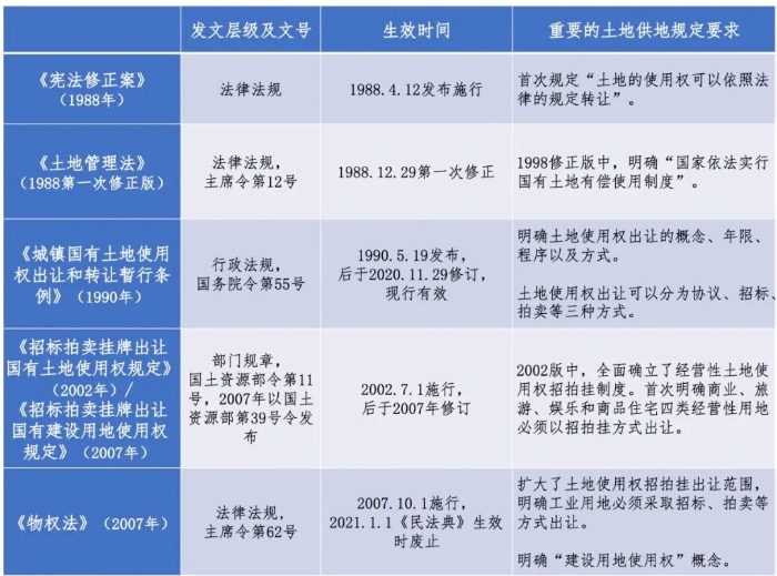 表1 土地供地方式有關(guān)政策(土地有償使用制度以來)