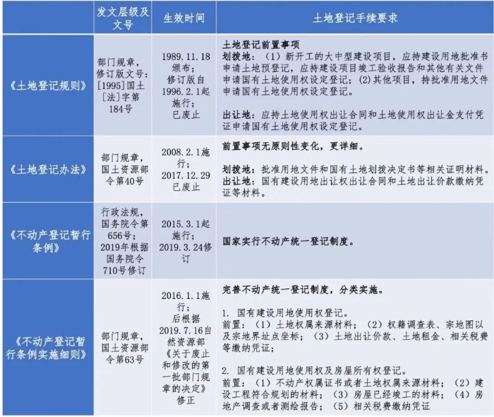 土地登記手續(xù)沿革情況如表4所示??梢钥吹剑覈恋氐怯浭掷m(xù)大致可分為兩個階段,以2015年施行的《不動產(chǎn)登記暫行條例》為分水嶺。第一階段以原國土資源部的《土地登記規(guī)則》和《土地登記辦法》為準(zhǔn)則,依據(jù)劃撥和出讓兩種土地取得方式,持批準(zhǔn)用地文件和國有土地劃撥決定書、國有土地使用權(quán)出讓合同和支付憑證等文件辦理土地登記。第二階段為2015年3月1日至今,建立并逐步完善了不動產(chǎn)統(tǒng)一登記制度。對于依法取得國有建設(shè)用地使用權(quán),可以單獨申請國有建設(shè)用地使用權(quán)登記;對于依法利用國有建設(shè)用地建造房屋的,可以申請國有建設(shè)用地使用權(quán)及房屋所有權(quán)登記。國有建設(shè)用地使用權(quán)登記的前置手續(xù)不變;而國有建設(shè)用地使用權(quán)登記及房屋所有權(quán)登記的前置手續(xù)包括工程規(guī)劃許可竣工驗收。