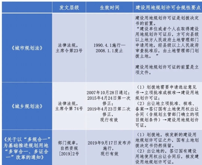 根據(jù)2008年開始施行的《城鄉(xiāng)規(guī)劃法》:(1)在城市、鎮(zhèn)規(guī)劃區(qū)內(nèi)以劃撥方式提供國有土地使用權(quán)的建設(shè)項目,經(jīng)有關(guān)部門批準(zhǔn)、核準(zhǔn)、備案后,建設(shè)單位應(yīng)當(dāng)向城市、縣人民政府城鄉(xiāng)規(guī)劃主管部門提出建設(shè)用地規(guī)劃許可申請,由城市、縣人民政府城鄉(xiāng)規(guī)劃主管部門依據(jù)控制性詳細(xì)規(guī)劃核定建設(shè)用地的位置、面積、允許建設(shè)的范圍,核發(fā)建設(shè)用地規(guī)劃許可證。建設(shè)單位在取得建設(shè)用地規(guī)劃許可證后,方可向縣級以上地方人民政府土地主管部門申請用地,經(jīng)縣級以上人民政府審批后,由土地主管部門劃撥土地。(2)以出讓方式取得國有土地使用權(quán)的建設(shè)項目,建設(shè)單位在取得建設(shè)項目的批準(zhǔn)、核準(zhǔn)、備案文件和簽訂國有土地使用權(quán)出讓合同后,向城市、縣人民政府城鄉(xiāng)規(guī)劃主管部門領(lǐng)取建設(shè)用地規(guī)劃許可證。城市、縣人民政府城鄉(xiāng)規(guī)劃主管部門不得在建設(shè)用地規(guī)劃許可證中,擅自改變作為國有土地使用權(quán)出讓合同組成部分的規(guī)劃條件。此項內(nèi)容在后續(xù)訂正過程中(最近一次修訂為2019年4月23日版本)未發(fā)生變化,至今生效。
