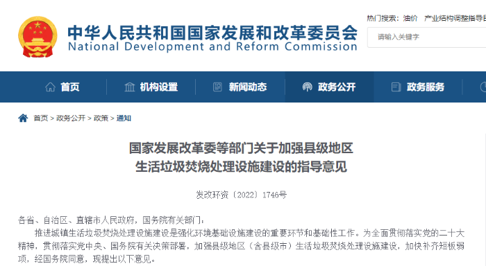 推進城鎮(zhèn)生活垃圾焚燒處理設施建設是強化環(huán)境基礎設施建設的重要環(huán)節(jié)和基礎性工作,是改善人居環(huán)境的重要內(nèi)容。黨中央、國務院高度重視城鎮(zhèn)環(huán)境基礎設施,黨的二十大報告明確提出要“提升環(huán)境基礎設施建設水平”。近日,經(jīng)國務院同意,國家發(fā)展改革委、住房和城鄉(xiāng)建設部、生態(tài)環(huán)境部、財政部、人民銀行等部門聯(lián)合印發(fā)《關于加強縣級地區(qū)生活垃圾焚燒處理設施建設的指導意見》(發(fā)改環(huán)資〔2022〕1746號,以下簡稱《指導意見》),全面系統(tǒng)提出加強縣級地區(qū)生活垃圾焚燒處理設施建設的指導思想、工作原則、主要目標、重點任務,指導各地有力有序推進焚燒處理設施建設?!吨笇б庖姟纷鳛槭讉€聚焦縣級地區(qū)生活垃圾處理的政策文件,是貫徹落實黨的二十大精神的重要舉措,對加快補齊縣級地區(qū)生活垃圾焚燒處理短板、提升生活垃圾治理水平、改善人居環(huán)境具有重要意義。
