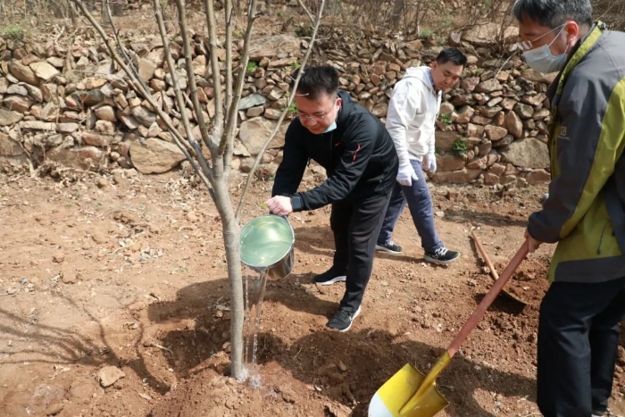 在植樹現(xiàn)場,大家揮鍬鏟土、培土圍堰、提水澆灌,一派熱火朝天的勞動景象。經(jīng)過大家通力協(xié)作,一株株梨樹在春風(fēng)中矗立,煥發(fā)出勃勃生機,為美麗北京添綠增彩。