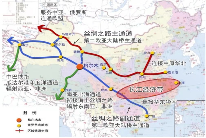通過新疆、西藏連接中亞、西亞、南亞形成交通運輸通道和國際貿(mào)易通道,即通過格爾木至西藏進入尼泊爾、印度的中尼跨喜馬拉雅通道,通過格爾木至喀什進入巴基斯坦的中巴經(jīng)濟走廊,通過格爾木至阿拉山口進入中亞、歐洲的新亞歐大陸橋經(jīng)濟走廊。逐步建立以鐵路口岸為主的口岸體系,積極申報綜合保稅區(qū)和自由貿(mào)易區(qū),完善與外貿(mào)發(fā)展相適應(yīng)的海關(guān)監(jiān)管、稅務(wù)、跨境電商、商貿(mào)服務(wù)等綜合配套功能,構(gòu)建科學合理、功能完備、智慧高效、綠色安全的國家口岸服務(wù)平臺。