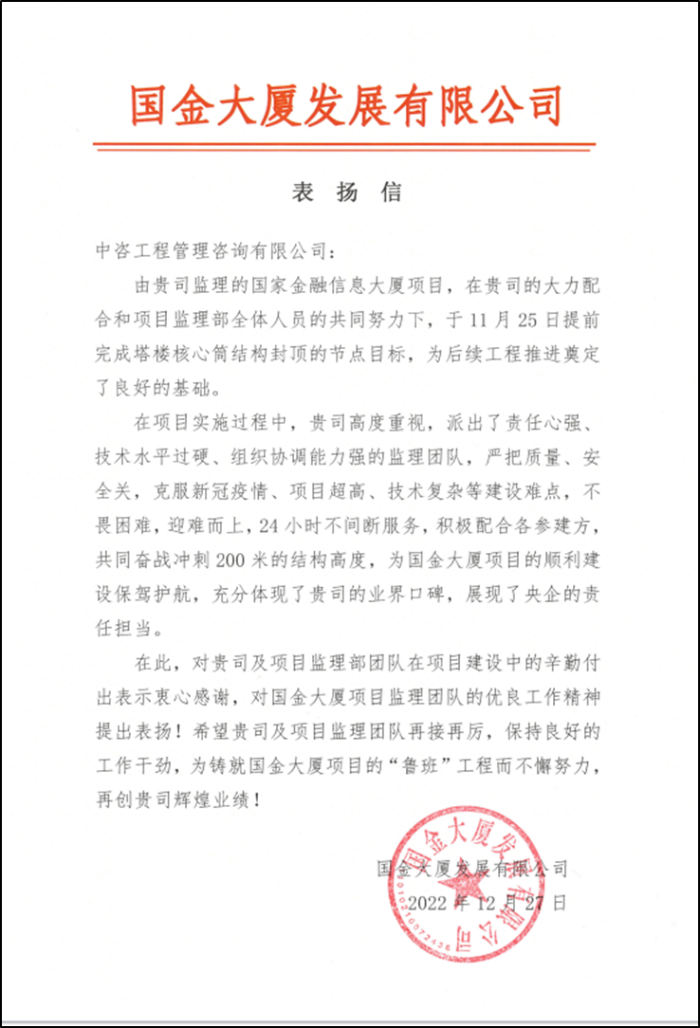 國家金融信息大廈項目是新華社與北京市政府開展金融信息服務全面戰(zhàn)略合作的重要成果。為加快助力構建具有全球影響力的金融信息產業(yè)集群,努力盡早建成國際一流新型全媒體機構,2022年9月,國家金融信息大廈項目業(yè)主方提出“百日會戰(zhàn),沖刺塔樓核心筒結構封頂”目標。該項目由中咨管理公司負責監(jiān)理任務。
