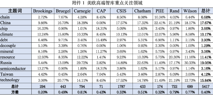 2023上半年,各歐美智庫與中國、俄羅斯等相關(guān)的主題報告占比在五分之二左右,與供應(yīng)鏈、芯片產(chǎn)業(yè)、半導(dǎo)體產(chǎn)業(yè)、礦產(chǎn)產(chǎn)業(yè)、脫鉤等相關(guān)的主題報告占比在五分之一左右,與氣候、資源、債務(wù)等相關(guān)的主題報告占比約五分之一,與臺灣、科技主題相關(guān)的報告約占五分之一。不同主題下智庫關(guān)注的重點領(lǐng)域分析參見附件1。