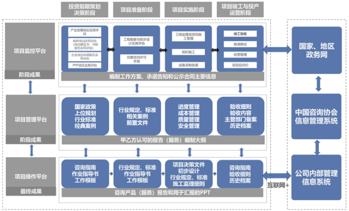 項(xiàng)目管理平臺(tái)。結(jié)合工作方案、上位規(guī)劃、國(guó)家重大政策和行業(yè)標(biāo)準(zhǔn)、前后置文件、相關(guān)案例、工作模板等,按照承擔(dān)的工程項(xiàng)目,編制經(jīng)甲乙雙方認(rèn)可的項(xiàng)目咨詢(xún)(服務(wù))報(bào)告大綱。