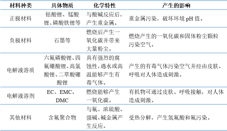 廢舊動力電池的正負極、電解液等材料對環(huán)境和人體健康具有潛在威脅,相關(guān)廢物已列入我國危險廢棄物名錄。正極材料的鎳、鈷、錳和鋰等多種金屬元素處理不當會對水體和土壤造成長期污染;負極材料石墨和碳燃燒后產(chǎn)生的一氧化碳和固體粉塵會污染空氣;電解液的主要成分為六氟磷酸鋰和碳酸酯等物質(zhì),具有強腐蝕性;磷元素則容易造成水體的富營養(yǎng)化。具體影響如表1所示。