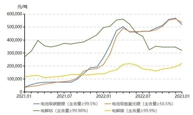 圖2 2021年—2022年12月電池級碳酸鋰、電池級氫氧化鋰、電解鈷、電解鎳價格走勢