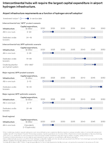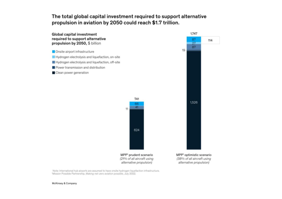在向新型推進(jìn)方式轉(zhuǎn)變的過程中,大型機(jī)場(chǎng)所需投資將明顯高于小型機(jī)場(chǎng),但其規(guī)模與其他重大投資相似,如建造一個(gè)新航站樓。一個(gè)洲際樞紐預(yù)計(jì)到2050年在整個(gè)價(jià)值鏈上的投資總額約為39億美元,其中包括能源收購和氫氣生產(chǎn),而一個(gè)主要的區(qū)域機(jī)場(chǎng)的投資約為13億美元。