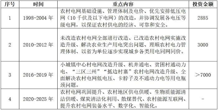 農(nóng)村電網(wǎng)改造升級(jí)是推動(dòng)鄉(xiāng)村振興戰(zhàn)略落地實(shí)施的重要抓手之一,農(nóng)村電網(wǎng)的改造升級(jí)能更好地滿足農(nóng)村居民美好生活需要的內(nèi)在要求,提升農(nóng)村地區(qū)電力保障水平,推進(jìn)城鄉(xiāng)電力服務(wù)均等化,推動(dòng)構(gòu)建農(nóng)村新型能源體系,對(duì)鞏固拓展脫貧攻堅(jiān)成果、促進(jìn)鄉(xiāng)村振興具有重要意義。我國(guó)自1998年實(shí)施第一輪農(nóng)村電網(wǎng)改造升級(jí)以來(lái),農(nóng)村電網(wǎng)改造升級(jí)成效顯著。