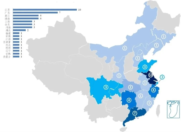 在空間分布上,呈現(xiàn)出東南沿海密集、東北西北稀疏以及與城市綜合競爭力強(qiáng)市重疊分布的特點(diǎn)。在全國31個(gè)?。ㄗ灾螀^(qū)、直轄市)中,集群涉及到省級(jí)單位19個(gè)、計(jì)劃單列市3個(gè)。其中,江蘇省擁有10個(gè)國家級(jí)先進(jìn)制造業(yè)集群,數(shù)量最多,其次是廣東省,擁有7個(gè)國家級(jí)先進(jìn)制造業(yè)集群。具體集群名稱詳見附表。