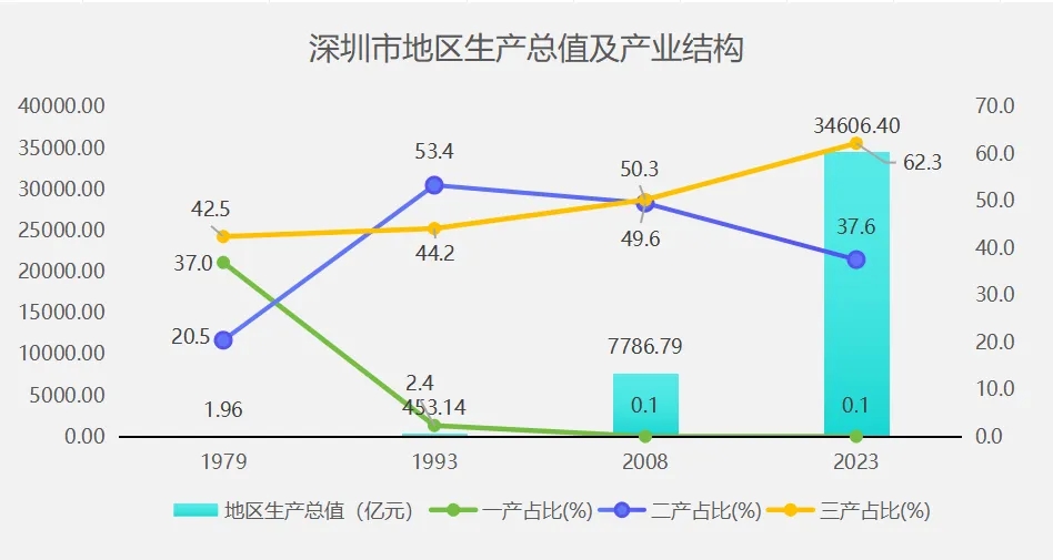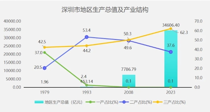 深圳經(jīng)濟(jì)特區(qū)建立44周年以來(lái),作為全國(guó)體制改革的試驗(yàn)田和對(duì)外開(kāi)放的重要窗口,堅(jiān)持改革創(chuàng)新,一路快速發(fā)展,地區(qū)生產(chǎn)總值從1979年的1.96億元增至2023年的3.46萬(wàn)億元,增長(zhǎng)超1.5萬(wàn)倍。深圳的三次產(chǎn)業(yè)結(jié)構(gòu)進(jìn)一步優(yōu)化,由1979年的37.020.542.5調(diào)整為2023年的0.1:37.6:62.3。第三產(chǎn)業(yè)占比已經(jīng)超過(guò)了第二產(chǎn)業(yè),說(shuō)明深圳的產(chǎn)業(yè)已經(jīng)從勞動(dòng)密集型向技術(shù)密集型轉(zhuǎn)變,從初級(jí)的加工制造向高新技術(shù)產(chǎn)業(yè)和現(xiàn)代服務(wù)業(yè)升級(jí)。