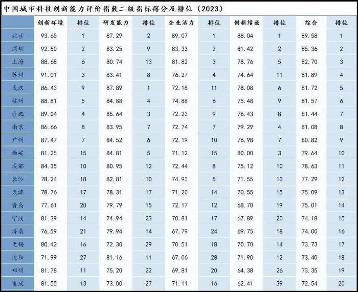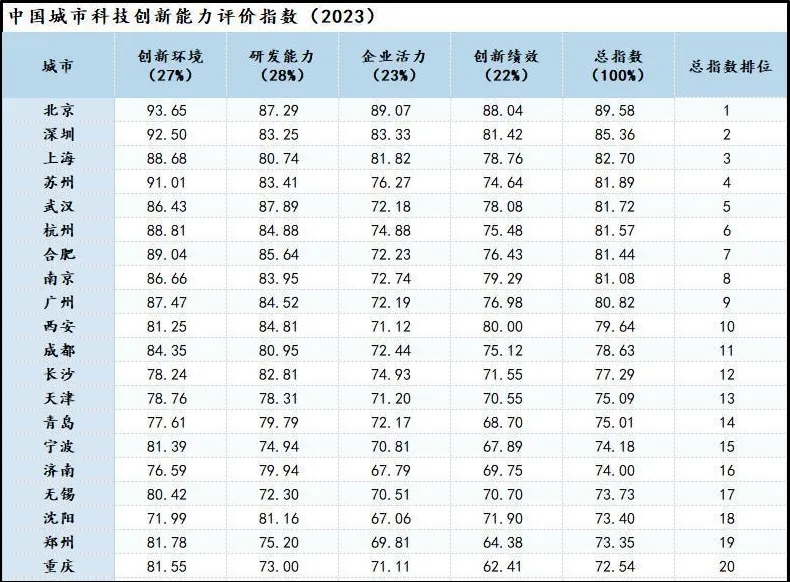 在《中國(guó)區(qū)域科技創(chuàng)新能力評(píng)價(jià)指數(shù)報(bào)告(2023)》“城市篇”中,界面智庫(kù)從創(chuàng)新環(huán)境、研發(fā)能力、企業(yè)活力和創(chuàng)新績(jī)效四個(gè)維度對(duì)國(guó)內(nèi)GDP超過(guò)5000億的55個(gè)城市進(jìn)行了科技創(chuàng)新能力的評(píng)估。結(jié)果顯示,科技創(chuàng)新能力10強(qiáng)城市依次為北京、深圳、上海、蘇州、武漢、杭州、合肥、南京、廣州和西安。作為重要的直轄市和區(qū)域經(jīng)濟(jì)中心,天津的科技創(chuàng)新能力總指數(shù)為75.09,排名處于第13位。