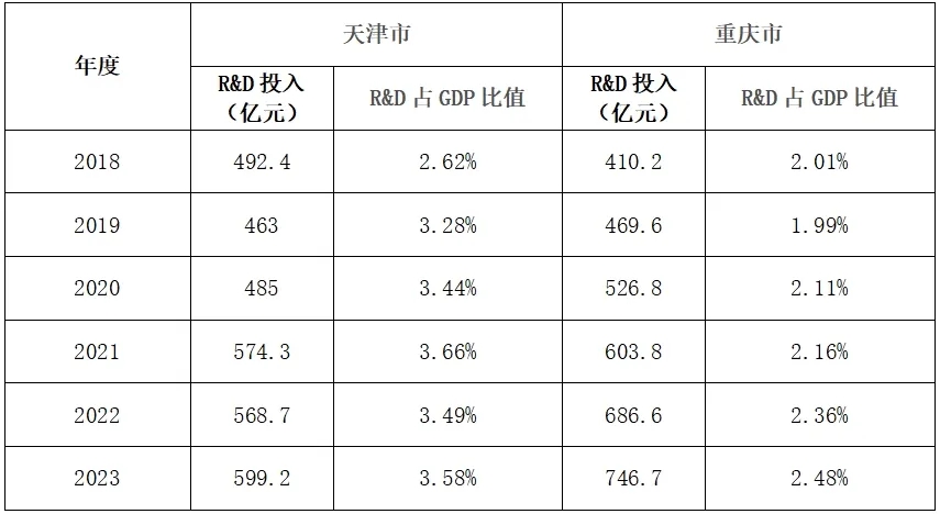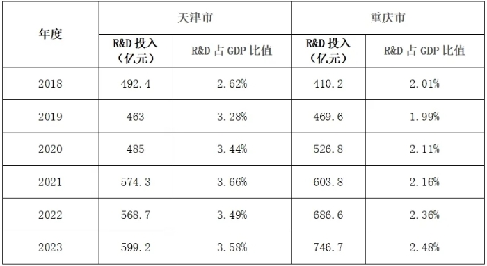 表2 天津市和重慶市2018-2023年R&D投入及GPD占比對(duì)比表