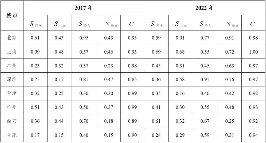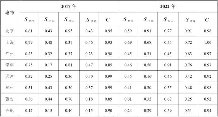 根據(jù)四系統(tǒng)耦合評(píng)價(jià)實(shí)證指標(biāo)體系,取得合肥、深圳、杭州、天津4個(gè)研究案例城市以及鄭州、廣州、上海、北京4個(gè)類比城市2017年及2022年的相關(guān)數(shù)據(jù);接著采用極差法對(duì)原始數(shù)據(jù)進(jìn)行標(biāo)準(zhǔn)化處理,并由熵權(quán)法確定各系統(tǒng)、各項(xiàng)評(píng)價(jià)指標(biāo)權(quán)重;通過(guò)綜合發(fā)展水平評(píng)價(jià)函數(shù)分別計(jì)算8個(gè)城市四系統(tǒng)的綜合發(fā)展水平值并分別用S環(huán)境、S主體j、S投入、S績(jī)效表示,通過(guò)耦合度模型及耦合協(xié)調(diào)度模型分別計(jì)算得各城市四系統(tǒng)的耦合度C值。根據(jù)S環(huán)境、S主體j、S投入、S績(jī)效、C共5個(gè)值,對(duì)樣本城市的評(píng)價(jià)可以從兩個(gè)方面展開(kāi),一個(gè)是基于S環(huán)境、S主體j、S投入、S績(jī)效值的耦合發(fā)展類型分析,另一個(gè)則是基于C值的耦合協(xié)調(diào)階段分析。