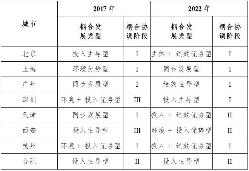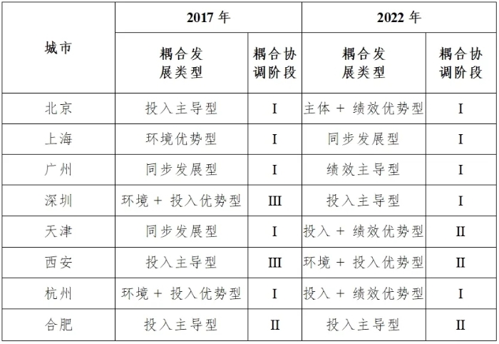 對(duì)比2017年與2022年兩個(gè)時(shí)間截面的城市類型(見(jiàn)表5),可以發(fā)現(xiàn)選取的8個(gè)城市的4個(gè)系統(tǒng)都處于高水平的耦合階段,且耦合程度總體呈現(xiàn)上升態(tài)勢(shì),說(shuō)明代表城市都在注重科創(chuàng)要素的協(xié)調(diào)發(fā)展。
