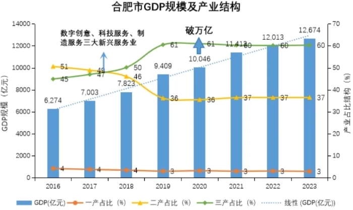 圖1 合肥市2016-2023年GDP規(guī)模及產(chǎn)業(yè)結(jié)構(gòu)發(fā)展示意