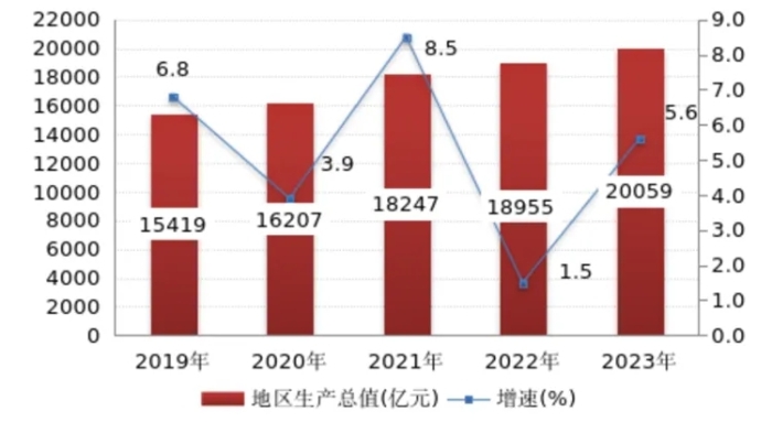 2019年,天津全市生產(chǎn)總值為14104.28億元。2021年全市地區(qū)生產(chǎn)總值15695.05億元,按可比價(jià)格計(jì)算,比上年增長(zhǎng)6.6%。2023年全市地區(qū)生產(chǎn)總值16737.30億元,按不變價(jià)格計(jì)算,比上年增長(zhǎng)4.3%,增速比上年加快3.3個(gè)百分點(diǎn)。