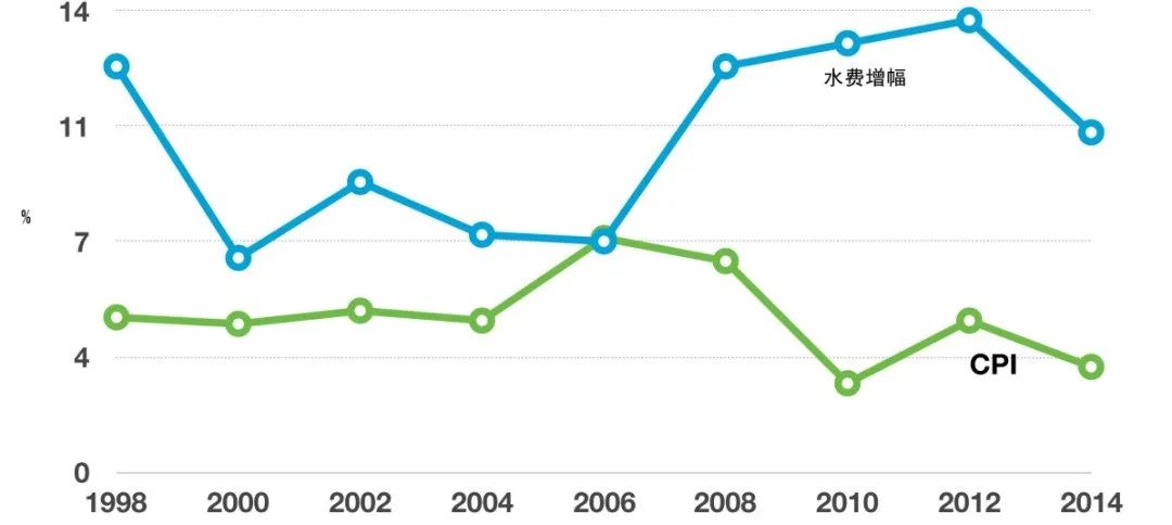 圖15 1998-2014年美國(guó)水費(fèi)增幅與CPI增幅情況對(duì)比