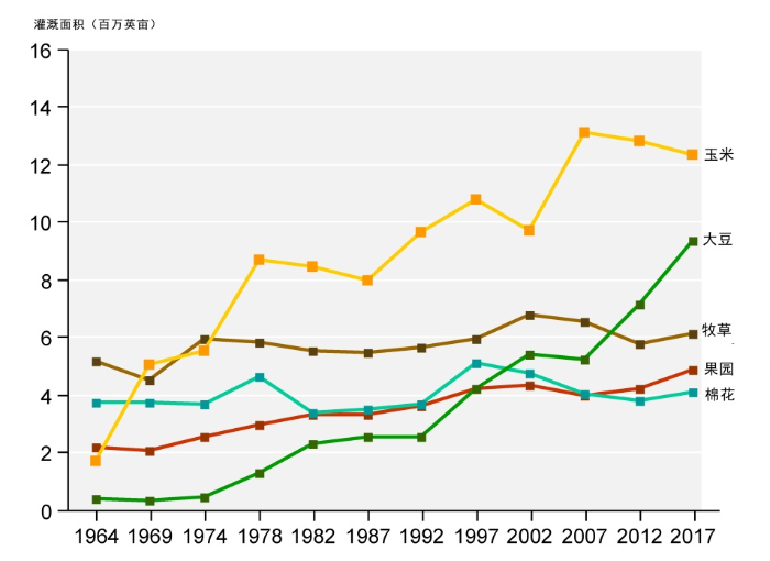 美國(guó)灌溉用水結(jié)構(gòu)不斷變化,主要表現(xiàn)為玉米和大豆的灌溉面積顯著增加。1964年美國(guó)主要灌溉農(nóng)作物是棉花和牧草,玉米和大豆加起來(lái)不到1518萬(wàn)畝。2017年玉米灌溉面積超過(guò)7284萬(wàn)畝,大豆灌溉面積超過(guò)5463萬(wàn)畝,見圖8。
