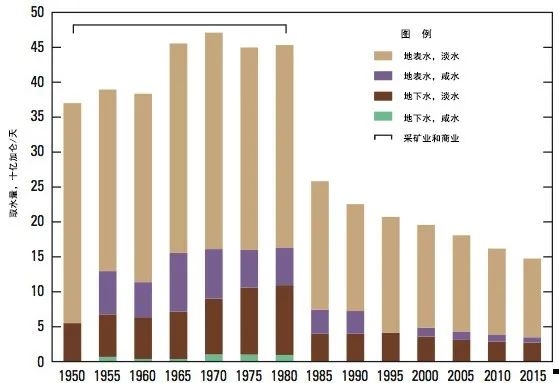 在產(chǎn)業(yè)結(jié)構(gòu)調(diào)整、工業(yè)生產(chǎn)效率提高、工業(yè)循環(huán)用水增加等綜合作用下,1985-2015年美國(guó)工業(yè)用水減少了43%左右,見圖12。
