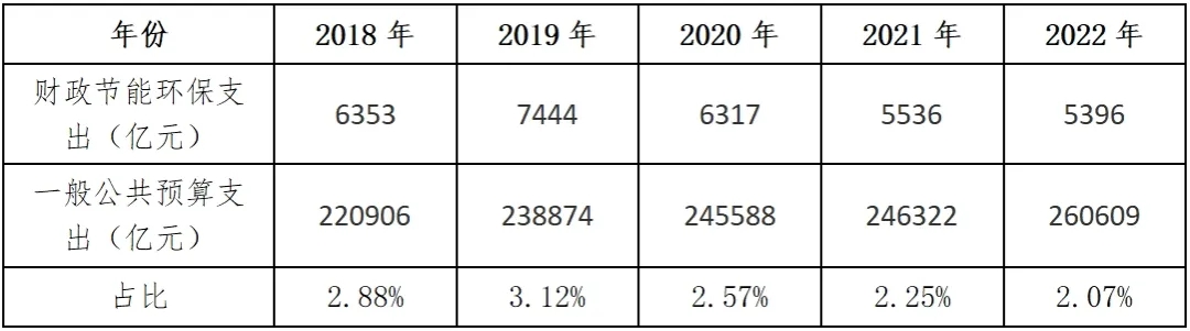 表1 2018年-2022年全國一般公共預(yù)算支出中節(jié)能環(huán)保支出及占比情況