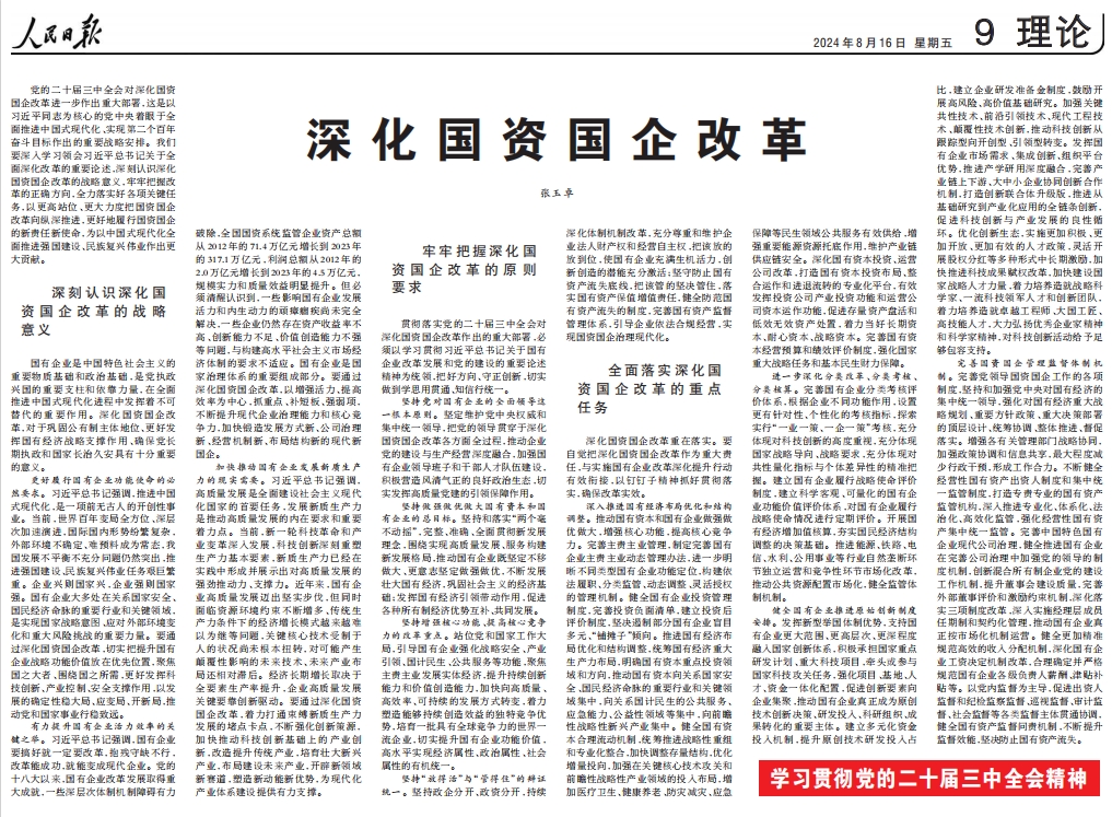 黨的二十屆三中全會(huì)對(duì)深化國(guó)資國(guó)企改革進(jìn)一步作出重大部署,這是以習(xí)近平同志為核心的黨中央著眼于全面推進(jìn)中國(guó)式現(xiàn)代化、實(shí)現(xiàn)第二個(gè)百年奮斗目標(biāo)作出的重要戰(zhàn)略安排。我們要深入學(xué)習(xí)領(lǐng)會(huì)習(xí)近平總書記關(guān)于全面深化改革的重要論述,深刻認(rèn)識(shí)深化國(guó)資國(guó)企改革的戰(zhàn)略意義,牢牢把握改革的正確方向,全力落實(shí)好各項(xiàng)關(guān)鍵任務(wù),以更高站位、更大力度把國(guó)資國(guó)企改革向縱深推進(jìn),更好地履行國(guó)資國(guó)企的新責(zé)任新使命,為以中國(guó)式現(xiàn)代化全面推進(jìn)強(qiáng)國(guó)建設(shè)、民族復(fù)興偉業(yè)作出更大貢獻(xiàn)。