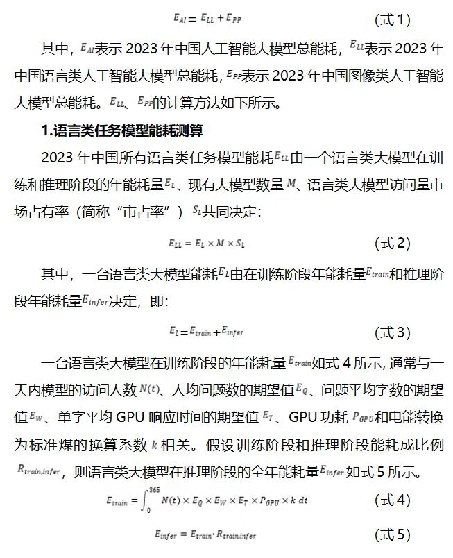 摘要:人工智能大模型技術(shù)引領(lǐng)的新興產(chǎn)業(yè)發(fā)展正成為全球新一輪科技革命和產(chǎn)業(yè)競(jìng)爭(zhēng)的新高地、新賽道。我國牢牢把握這一戰(zhàn)略機(jī)遇,推動(dòng)新一代人工智能模型成為新質(zhì)生產(chǎn)力的典型代表,實(shí)現(xiàn)全產(chǎn)業(yè)高質(zhì)量發(fā)展。然而,人工智能模型性能發(fā)展所依托的模型參數(shù)擴(kuò)張、訓(xùn)練次數(shù)升級(jí)以及伴隨著的使用頻率躍增,已然導(dǎo)致算力需求和能源消費(fèi)過快增長。在當(dāng)前嚴(yán)峻的節(jié)能形勢(shì)背景下,人工智能的能耗問題與節(jié)能工作之間的潛在矛盾備受關(guān)注。鑒于此,本文對(duì)人工智能的能耗影響及挑戰(zhàn)進(jìn)行了測(cè)算分析,認(rèn)為人工智能產(chǎn)業(yè)能耗的長期影響總體可控,但短期局部影響仍然突出,或與節(jié)能工作形成沖突,建議從強(qiáng)化產(chǎn)業(yè)發(fā)展要素保障、摸排產(chǎn)業(yè)發(fā)展情況、建立綠色低碳管理機(jī)制、深化“東數(shù)西算”格局四個(gè)方面,推動(dòng)人工智能產(chǎn)業(yè)綠色低碳發(fā)展。 一、研究背景 以大模型為代表的人工智能技術(shù)和產(chǎn)業(yè)已成為當(dāng)今經(jīng)濟(jì)社會(huì)發(fā)展的重要支撐,發(fā)展新一代人工智能大模型是加快形成新質(zhì)生產(chǎn)力、培育經(jīng)濟(jì)發(fā)展新動(dòng)能、贏得全球科技競(jìng)爭(zhēng)主動(dòng)權(quán)的戰(zhàn)略抓手。自2020年起,人工智能由傳統(tǒng)的“判別式小模型”轉(zhuǎn)向更為先進(jìn)的“生成式大模型”,代表性功能也從人臉識(shí)別、目標(biāo)檢測(cè)、文本分類升級(jí)到如今的文本生成、圖像生成、語音生成、視頻生成等。 人工智能大模型計(jì)算系統(tǒng)通常由深度神經(jīng)網(wǎng)絡(luò)構(gòu)建而成,具有萬億量級(jí)參數(shù)規(guī)模和復(fù)雜計(jì)算結(jié)構(gòu),能夠根據(jù)已學(xué)習(xí)的內(nèi)容進(jìn)行基礎(chǔ)性地判斷以及創(chuàng)造性地生成新內(nèi)容。其中,語言類和圖像類任務(wù)大模型應(yīng)用場(chǎng)景較為廣泛,正成為當(dāng)前人工智能技術(shù)研究和應(yīng)用的熱點(diǎn)方向。具體而言,語言類任務(wù)大模型主要用于理解和生成自然語言文本,處理諸如文本分類、問答系統(tǒng)、文字生成等文字任務(wù),代表性模型有OpenAI公司發(fā)布的ChatGPT、百度公司發(fā)布的文心一言等。圖像類任務(wù)大模型則主要用于處理和理解圖像內(nèi)容,執(zhí)行諸如圖像分類、目標(biāo)檢測(cè)、圖像生成等視覺任務(wù),代表性模型包括OpenAI公司的DALL-E、智譜人工智能研究院的CogVLM等。 隨著人工智能技術(shù)的快速發(fā)展,其背后的算力支撐和電力供應(yīng)變得愈發(fā)關(guān)鍵。算力,即單位時(shí)間內(nèi)處理數(shù)據(jù)或信息的能力(FLOPS),主要以計(jì)算機(jī)設(shè)備、數(shù)據(jù)中心、智算中心等算力基礎(chǔ)設(shè)施作為運(yùn)行載體,而電力則為其提供必要的能源支撐,以確保算力的穩(wěn)定高效運(yùn)行。由于人工智能技術(shù)的快速發(fā)展高度依賴于模型參數(shù)規(guī)模擴(kuò)大、訓(xùn)練次數(shù)升級(jí)以及伴隨著的使用頻率躍增,算力需求和能源消耗呈現(xiàn)快速增長態(tài)勢(shì),也由此引發(fā)了一系列關(guān)注。然而已有研究多聚焦于能耗總量分析,鮮有深入探討其時(shí)空分布特點(diǎn)以及結(jié)合節(jié)能工作形勢(shì)全面分析能耗挑戰(zhàn)。為此,本文以語言類和圖像類大模型兩類人工智能大模型為代表對(duì)人工智能能耗進(jìn)行了測(cè)算,并結(jié)合時(shí)空分布以及節(jié)能工作形勢(shì)分析了人工智能能耗帶來的挑戰(zhàn),最后從要素保障、產(chǎn)業(yè)摸底、管理機(jī)制、戰(zhàn)略格局等維度提出了政策建議,以期為我國人工智能產(chǎn)業(yè)綠色低碳發(fā)展提供有力支撐。 二、研究方法與數(shù)據(jù) 本研究基于人工智能領(lǐng)域相關(guān)政策文件、研究報(bào)告、學(xué)術(shù)文獻(xiàn)等最新信息,構(gòu)建了以語言類大模型和圖像類大模型能耗情況為代表的人工智能大模型能耗計(jì)算方法,并對(duì)我國人工智能發(fā)展的能耗影響進(jìn)行了測(cè)算分析。 (一)大模型總能耗現(xiàn)狀測(cè)算 當(dāng)前中國人工智能大模型總能耗主要由語言類大模型總能耗和圖像類大模型總能耗構(gòu)成(受限于數(shù)據(jù)可得性,以2023年大模型發(fā)展情況對(duì)其能耗水平現(xiàn)狀進(jìn)行測(cè)算),如式1所示: (二)數(shù)據(jù)來源 計(jì)算過程的參數(shù)設(shè)置與數(shù)據(jù)來源如下表所示。在人工智能大模型能耗現(xiàn)狀計(jì)算方面,主要參數(shù)包括每天訪問人數(shù)、人均問題數(shù)、問題平均字?jǐn)?shù)等。其中,每天訪問人數(shù)、語言類大模型訪問量市占率、圖像模型與語言模型訪問量市占率比例均來自非凡產(chǎn)研[1]的2024年度報(bào)告。單字平均GPU響應(yīng)時(shí)間數(shù)值來自Pointon(2022)[2],即0.35秒/字。根據(jù)Patterson等人[3]的研究結(jié)果,GPU功率為400瓦特?;贚uccioni & Jernite(2023)[4],語言類大模型訓(xùn)練和推斷階段的能耗比例為2:3,圖像任務(wù)能耗與語言任務(wù)能耗比例為30:1。中國現(xiàn)有大模型總數(s