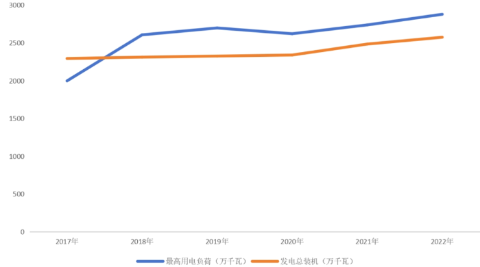 受益于經(jīng)濟(jì)和社會(huì)的快速發(fā)展,蘇州電力消費(fèi)水平持續(xù)提升。受氣候變化以及居民生活水平提高等影響,蘇州空調(diào)負(fù)荷成為電力需求增長(zhǎng)的重要驅(qū)動(dòng)因素。近五年來(lái),蘇州市最高用電負(fù)荷保持年均增速7.59%的快速增長(zhǎng),截至2022年蘇州市最高用電負(fù)荷達(dá)到2877萬(wàn)千瓦[6]。同時(shí)期,蘇州發(fā)電裝機(jī)僅保持2.3%的緩慢增長(zhǎng),截至2022年發(fā)電總裝機(jī)僅2573萬(wàn)千瓦[7],如圖1所示。作為大受端電網(wǎng),蘇州大量用電依靠區(qū)外來(lái)電,在極端天氣下,存在一定的電力保供風(fēng)險(xiǎn)。