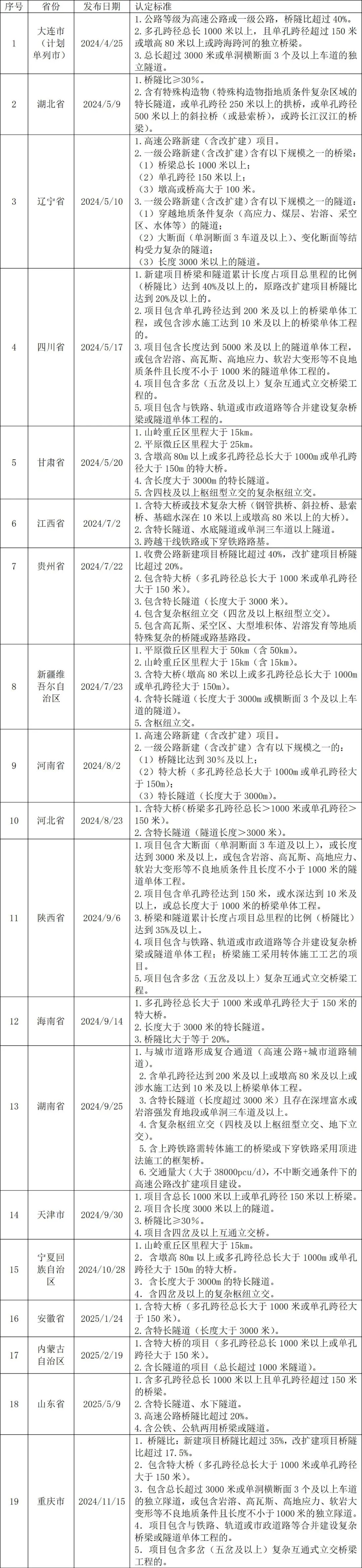 編者按:2023年11月,《關(guān)于規(guī)范實施政府和社會資本合作新機制的指導(dǎo)意見》(國辦函〔2023〕115號)發(fā)布,投資規(guī)模大、建設(shè)難度高的收費公路等項目被列為“積極創(chuàng)造條件、支持民營企業(yè)參與”的項目,不強制要求民營企業(yè)在PPP項目公司具體持股比例。除此類項目外,其他收費公路項目需滿足“民營企業(yè)股權(quán)占比原則上不低于35%”。PPP新機制發(fā)布近兩年來,各地陸續(xù)出臺對“投資規(guī)模大、建設(shè)難度高”收費公路項目量化認(rèn)定標(biāo)準(zhǔn)。本研究系統(tǒng)梳理截至2025年9月底全國各地已正式發(fā)布的全部官方標(biāo)準(zhǔn),基于投資規(guī)模與建設(shè)難度兩個維度開展比較分析。各地出臺的認(rèn)定標(biāo)準(zhǔn)是PPP新機制下地方政府精細(xì)化、差異化治理的具體實踐,為市場主體提供了投資指引,同時成為觀察區(qū)域基建重點與政策導(dǎo)向的重要窗口。本文是PPP新機制觀察系列研究:收費公路“投資規(guī)模大、建設(shè)難度高”認(rèn)定標(biāo)準(zhǔn)的第二部分,分析“建設(shè)難度高”的具體界定標(biāo)準(zhǔn)以及闡述“投資規(guī)模大”與“建設(shè)難度高”綜合認(rèn)定標(biāo)準(zhǔn),供業(yè)界同仁參考。 “PPP新機制觀察”系列研究 收費公路“建設(shè)難度高”認(rèn)定標(biāo)準(zhǔn) 郭艷鑫 張雪飛 伍迪 摘要:本研究系統(tǒng)梳理截至2025年9月底全國各地已正式發(fā)布的“投資規(guī)模大、建設(shè)難度高”收費公路項目認(rèn)定標(biāo)準(zhǔn),研究發(fā)現(xiàn),在“建設(shè)難度高”方面,許多地方的認(rèn)定標(biāo)準(zhǔn)充分參考了國家有關(guān)規(guī)范,也深度融合了地域特征,如西南地區(qū)強調(diào)橋隧比,西北地區(qū)側(cè)重山嶺重丘區(qū)里程等,本文為理解地方PPP治理邏輯、區(qū)域差異及政策協(xié)同提供了實踐依據(jù)。 關(guān)鍵詞:PPP;特許經(jīng)營;新機制;收費公路;投資規(guī)模大;建設(shè)難度高;認(rèn)定標(biāo)準(zhǔn);區(qū)域差異 2023年11月,國務(wù)院辦公廳轉(zhuǎn)發(fā)國家發(fā)展改革委、財政部《關(guān)于規(guī)范實施政府和社會資本合作新機制的指導(dǎo)意見》(國辦函〔2023〕115號,以下簡稱《指導(dǎo)意見》),標(biāo)志著我國政府和社會資本合作(PPP)事業(yè)邁入全新發(fā)展階段。PPP新機制明確三大核心導(dǎo)向,即社會資本優(yōu)先選擇民營企業(yè)、回報機制聚焦使用者付費、實施模式全部采用特許經(jīng)營。其中,最大程度鼓勵民營企業(yè)參與,既是貫徹落實黨中央、國務(wù)院決策部署的關(guān)鍵舉措,也是引導(dǎo)市場回歸PPP初衷本源、進一步調(diào)動民間投資積極性的重要抓手。 《指導(dǎo)意見》明確,“最大程度鼓勵民營企業(yè)參與政府和社會資本合作新建(含改擴建)項目”,這一要求既契合我國引入PPP模式的初衷,也順應(yīng)了當(dāng)前激發(fā)民間資本投資活力的客觀需求。同時,考慮到國有企業(yè)是我國市場主體的重要組成部分,《指導(dǎo)意見》并未對國有企業(yè)參與PPP項目采取“一刀切”式禁止,而是制定了《支持民營企業(yè)參與的特許經(jīng)營新建(含改擴建)項目清單(2023年版)》(以下簡稱《清單》)。該《清單》依據(jù)市場化程度、公共屬性強弱、是否具備自然壟斷性等特征,對新建(含改擴建)項目進行分類設(shè)置民營企業(yè)參與要求,將“屬于市場的還給市場”,充分體現(xiàn)新機制在兼顧PPP項目公益性的同時、最大化釋放市場效率的政策導(dǎo)向。具體而言,市場化程度較高、公共屬性較弱的項目,應(yīng)由民營企業(yè)獨資或控股;關(guān)系國計民生、公共屬性較強的項目,民營企業(yè)股權(quán)占比原則上不低于35%;少數(shù)涉及國家安全、公共屬性強且具備自然壟斷屬性的項目,需積極創(chuàng)造條件支持民營企業(yè)參與。 值得關(guān)注的是,《清單》對收費公路項目的分類較為特殊:不符合“投資規(guī)模大、建設(shè)難度高”情形的收費公路項目,歸為“關(guān)系國計民生、公共屬性較強”的第二類項目,民營企業(yè)股權(quán)占比原則上不低于35%;“投資規(guī)模大、建設(shè)難度高”的收費公路等項目,則歸為第三類項目,需通過積極創(chuàng)造條件支持民營企業(yè)參與,但未強制要求民營企業(yè)參股比例。 為明確“投資規(guī)模大、建設(shè)難度高”的認(rèn)定邊界,部分地區(qū)陸續(xù)公開發(fā)布收費公路項目量化認(rèn)定細(xì)則。截至2025年9月底,全國已有19個省級行政區(qū)和計劃單列市出臺了收費公路“投資規(guī)模大、建設(shè)難度高”認(rèn)定標(biāo)準(zhǔn)(以下簡稱認(rèn)定標(biāo)準(zhǔn)),不同區(qū)域標(biāo)準(zhǔn)既存在差異也具備共性。本文聚焦各地出臺的相關(guān)認(rèn)定標(biāo)準(zhǔn)開展研究,并重點關(guān)注“建設(shè)難度高”維度的指標(biāo),形成若干思考,旨在為業(yè)界提供參考借鑒。 一、“建設(shè)難度高”認(rèn)定標(biāo)準(zhǔn) (一)基本信息 整體來看,在“建設(shè)難度高”的認(rèn)定上,各地采用的建設(shè)難度指標(biāo)可歸納為八大類:特大橋、特長隧道、橋隧比、復(fù)雜地質(zhì)條件、山嶺重丘區(qū)里程、特殊工程結(jié)構(gòu)、復(fù)雜樞紐立交、高