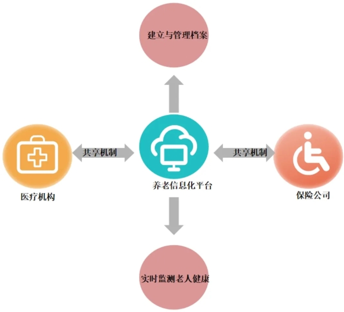 圖4 家庭+養(yǎng)老信息化平臺(tái)+醫(yī)療機(jī)構(gòu)+保險(xiǎn)公司模式示意