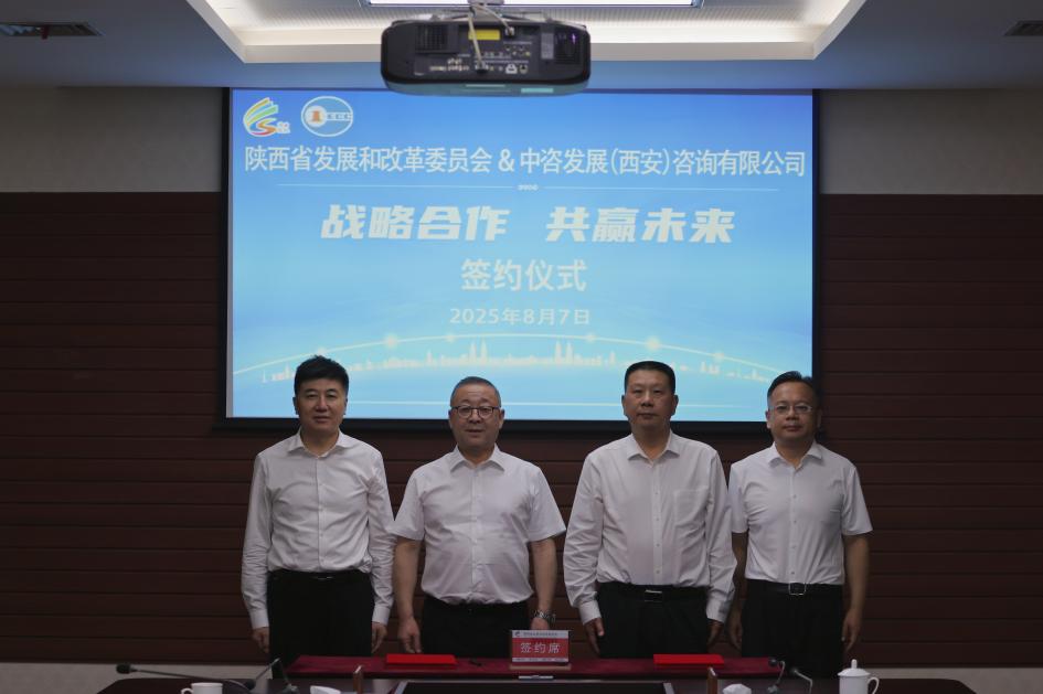 2025年8月7日,中咨發(fā)展(西安)咨詢有限公司(簡稱中咨西安公司)與陜西省發(fā)展改革委簽署戰(zhàn)略合作協(xié)議,致力于創(chuàng)新構建全鏈條咨詢服務體系,助推陜西在新時代西部大開發(fā)中更好發(fā)揮示范作用。中咨公司黨委委員、副總經(jīng)理潘小海與陜西省發(fā)展改革委主任王青峰、陜西省工程咨詢協(xié)會會長張堅出席簽約儀式。中咨西安公司執(zhí)行董事、總經(jīng)理,中咨公司交通業(yè)務部副主任趙東與陜西省發(fā)展改革委黨組成員、副主任溫志剛代表雙方簽署協(xié)議。雙方舉行座談交流。